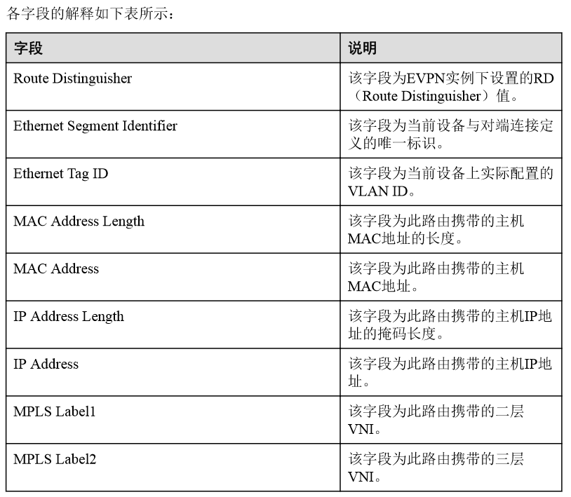 要实现同子网主机的二层互访,两端VTEP需要相互学习主机MAC。作为BGP EVPN对等体的VTEP之间通过交换MAC/IP路由,可以相互通告已经获取到的主机 MAC。其中,MAC Address Length和MAC Address字段为主机MAC地址。