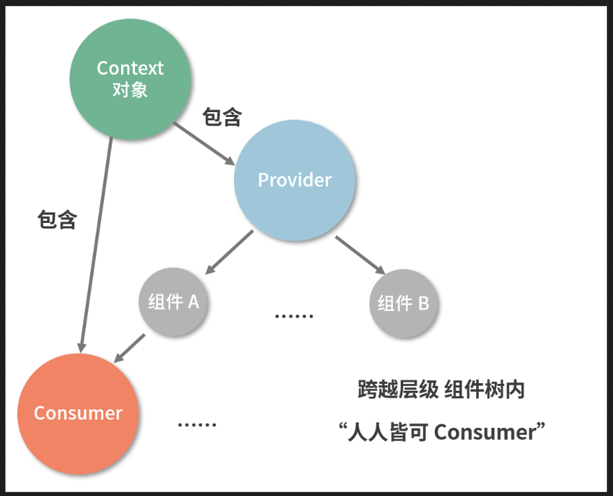 Context API创建出一组Provider,Provider作为数据的提供方, 可以将数据下发给自身组件树中任意层级的Consumer