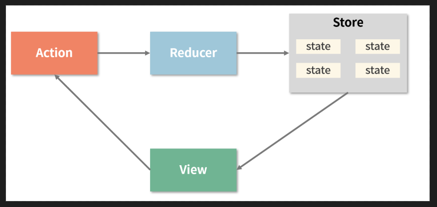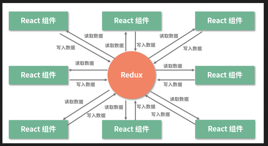 dispatch action=>commit reducer=>update store - 对于组件来说, 任何组件都可以通过约定的方式从