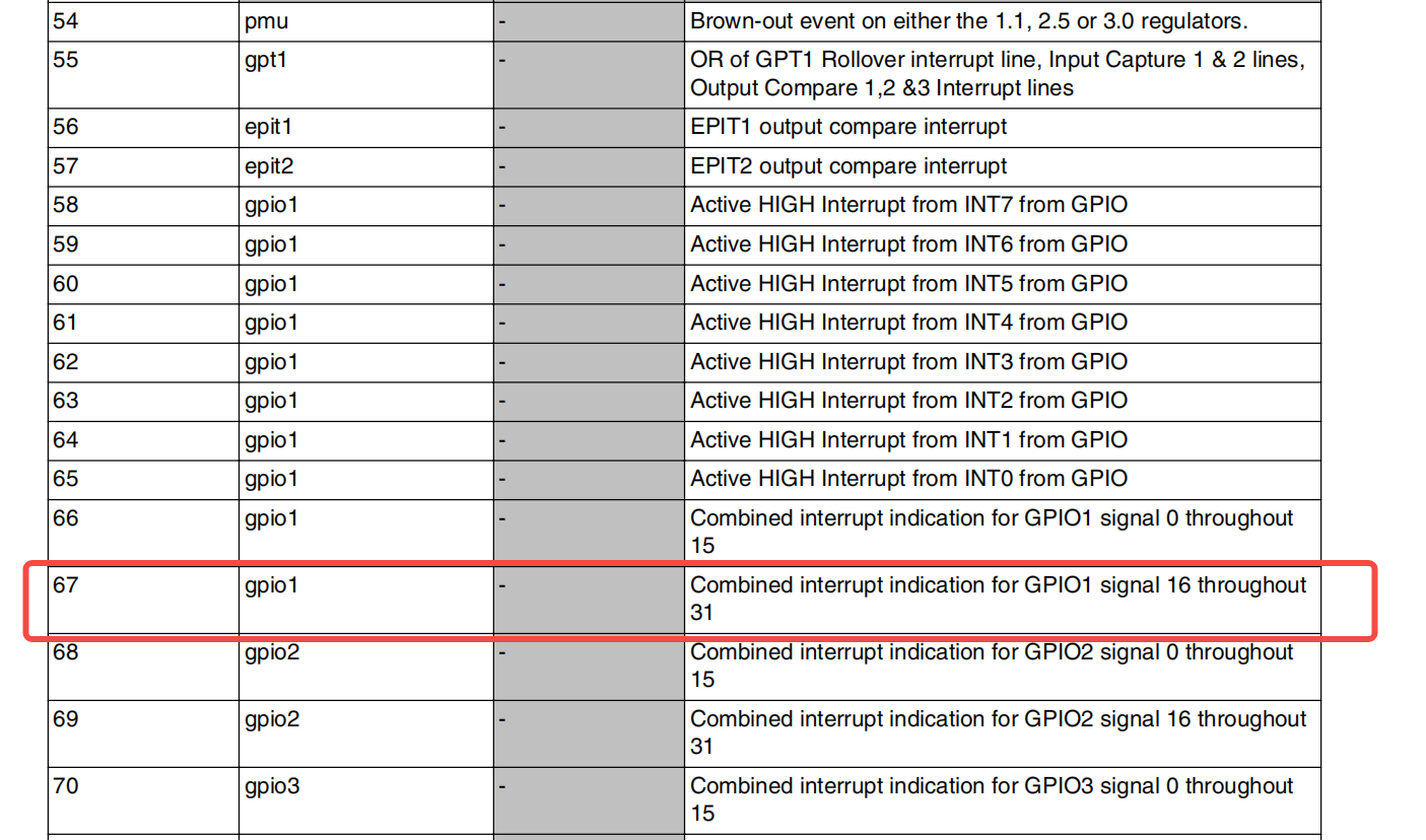 4、使能GIC中断号,参考imx6ull的参考手册第三章,得到中断号为67+32 = 99,gpio1_16 - gpio1_31共用中断号99