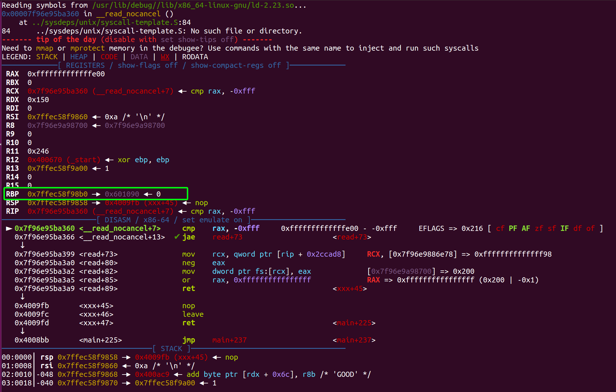 gdb调试:发现在执行r.sendlineafter(b"a:\n",b"520")后,rbp的值就是n+4的地址