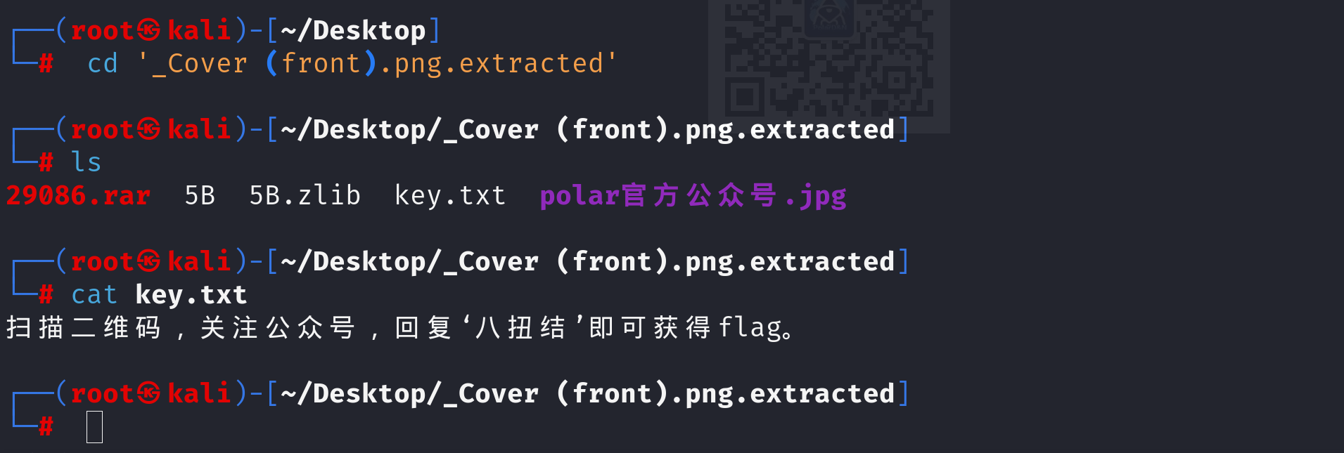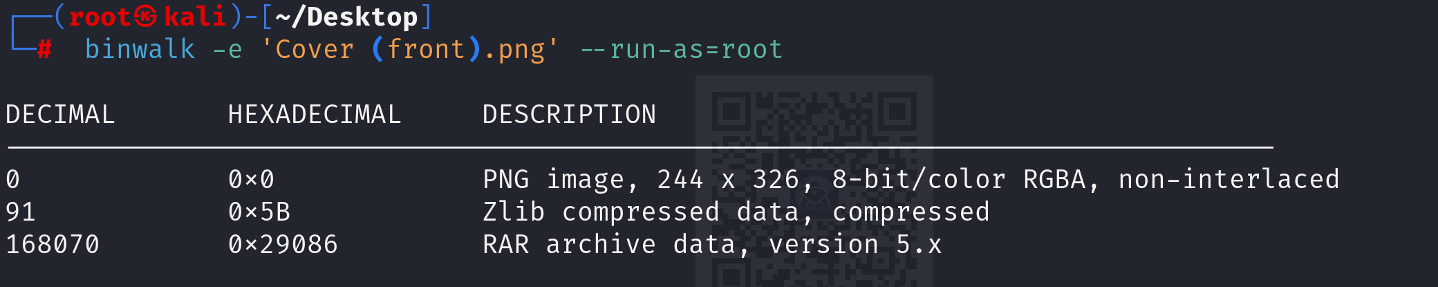 使用binwalk -e 'Cover (front).png' --run-as=root分离