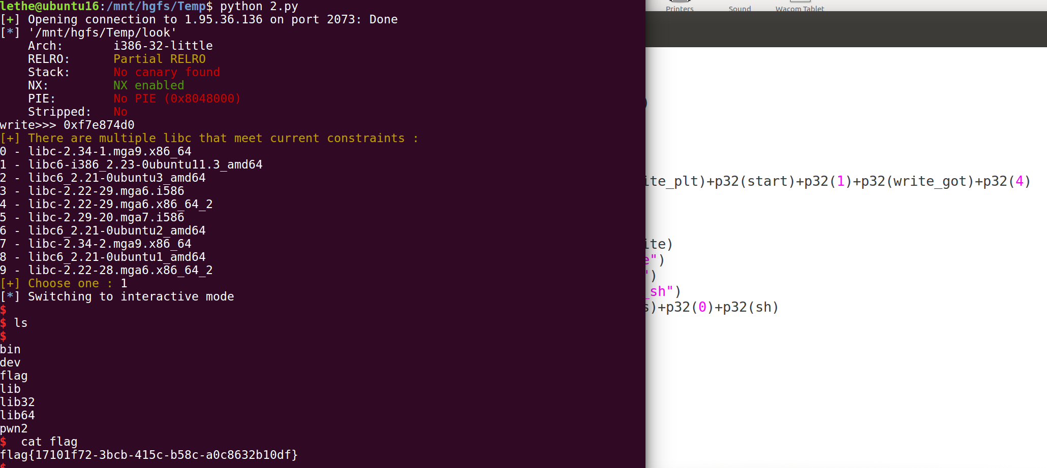 栈溢出->利用write泄露其got地址->计算libc基地址、system和/bin/sh地址->返回start->再次栈溢出->执行system->0->sh->shell