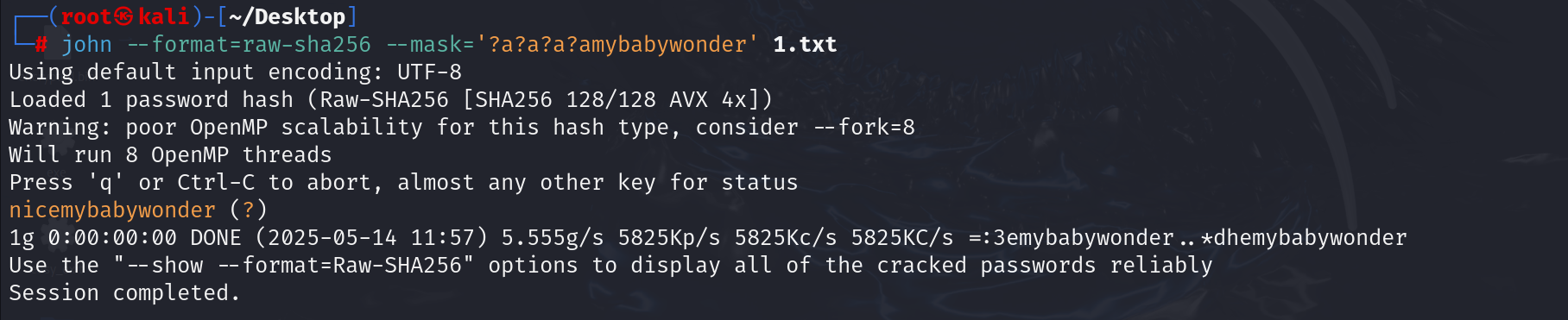 john --format=raw-sha256 --mask='?a?a?a?amybabywonder' 1.txt