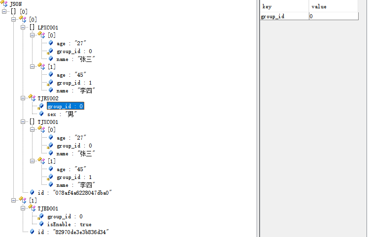1 data=[ 2 3 {'id': '078af4a6228047dba0' , 'main_code': 'TJ' , 'code': 'XC001' , ‘groupid’: 0 , 'column_name': 'name' , 'column_value': '张三'}, 4 5 {'id': '078af4a6228047dba0' , 'main_code': 'TJ', 'code': 'XC001' , ‘groupid’: 0, 'column_name': 'age' , 'column_value': '27'}, 6 7 {'id':'078af4a6228047dba0', 'main_code': 'TJ','code':'XC001',‘groupid’:1,'column_name':'name','column_value':'李四'}, 8 9 {'id':'078af4a6228047dba0', 'main_code': 'TJ','code':'XC001',‘groupid’:1,'column_name':'age','column_value':'45'}, 10 11 {'id': '078af4a6228047dba0' , 'main_code': 'LP' , 'code': 'XC001' , ‘groupid’: 0 , 'column_name': 'name' , 'column_value': '张三'}, 12 13 {'id': '078af4a6228047dba0' , 'main_code': 'LP', 'code': 'XC001' , ‘groupid’: 0, 'column_name': 'age' , 'column_value': '27'}, 14 15 {'id':'078af4a6228047dba0', 'main_code': 'LP','code':'XC001',‘groupid’:1,'column_name':'name','column_value':'李四'}, 16 17 {'id':'078af4a6228047dba0', 'main_code': 'LP','code':'XC001',‘groupid’:1,'column_name':'age','column_value':'45'}, 18 19 {'id':'078af4a6228047dba0', 'main_code': 'TJ','code':'RY002',‘groupid’:0,'column_name':'sex','column_value':'男'}, 20 21 {'id':'82970de3e3b836d34', 'main_code': 'TJ','code':'BD001',‘groupid’:0,'column_name':'isEnable','column_value':True} 22 23 ] 24 25 from operator import itemgetter 26 from itertools import groupby 27 import json 28 data.sort(key=itemgetter('id')) 29 datas = [] 30 # id分组 31 for id, items in groupby(data, key=itemgetter('id')): 32 data_dict = {'id': id} 33 for code_info, item in groupby(items, key=itemgetter('main_code','code')): 34 if code_info[0]: 35 column=[] 36 list_item=[i for i in item] 37 list_item.sort(key=itemgetter('groupid')) 38 for group_id,g_item in groupby(list_item,key=itemgetter('groupid')): 39 column_dict = {} 40 for gi in g_item: 41 column_dict[gi.get('column_name')] = gi.get('column_value') 42 column_dict['group_id'] = group_id 43 column.append(column_dict) 44 data_dict[f'{code_info[0]}{code_info[1]}'] = column if len(column)>1 else column[0] 45 else: 46 data_dict[f'{code_info[0]}{code_info[1]}'] = '无数据' 47 datas.append(data_dict) 48 print(json.dumps(datas,ensure_ascii=False))