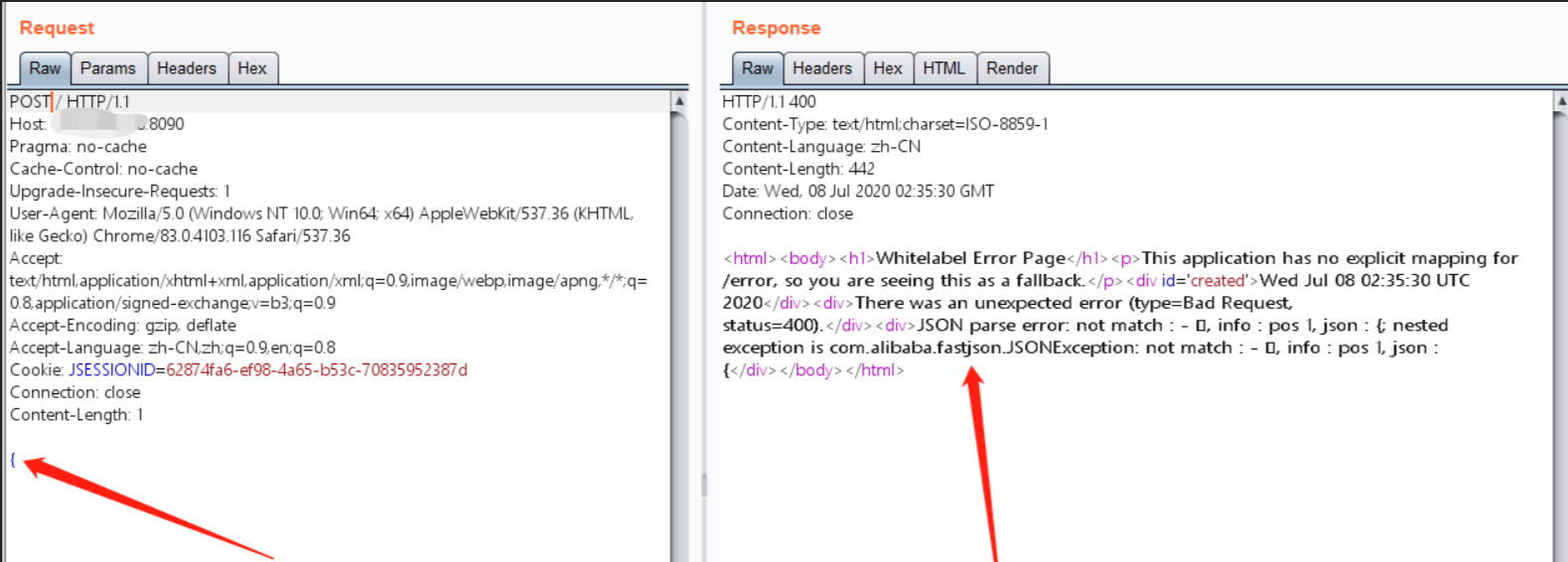 任意抓个包,提交方式改为POST,花括号不闭合。返回包在就会出现fastjson字样。当然这个可以屏蔽!