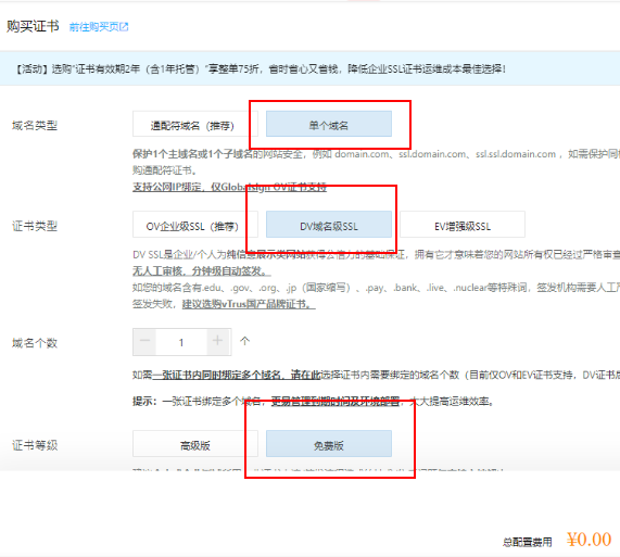2.购买免费版ssl证书,购买完之后,填写域名信息