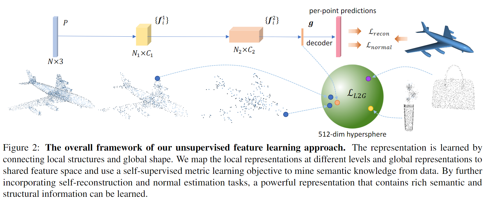 这篇文章的灵感来源于生活中人们看到一个物体的一部分就能够知道该物体是什么,也即通过观察物体的局部就能得出全局。作者假设3D物体强大的特征表示建立于一个物体局部和全局间共享的且能与其他物体区分的属性,并提出从局部推断全局和从全局推断局部两个任务来学习点云的特征表示。