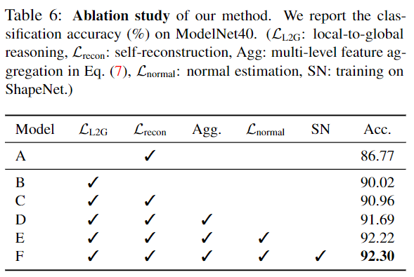 其实这篇文章从观点到实现,逻辑性个人感觉不是很强。为什么用重构和法向量估计这两个任务就能保证全局特征的质量?论文前面所讲的一些概念在我看来其实比较抽象,跟实现的好像并没有很大的联系。