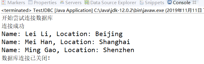 System.out.println("Name: "+result.getString("DNAME")+", Location: "+result.getString("LOC"));