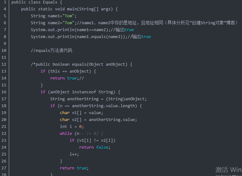 return true;//地址相同了。内容一定相同所以会返回true.结束equals方法。