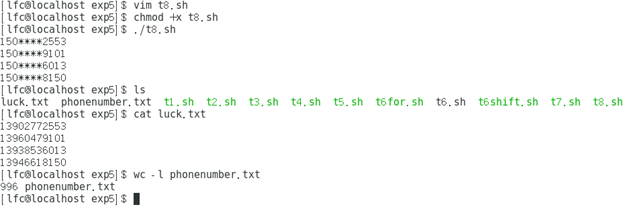 8、在第7题产生的1000个电话号码中抽取5位幸运号码,并显示,要求只显示前3三位数字和后4位数字,中间四位用*代替。N2=$[ $RANDOM%10]