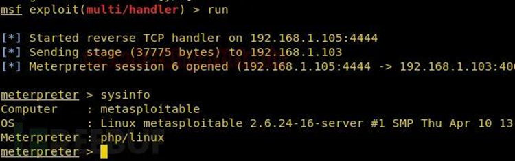 Metasploit监听进程就会成功返回一个控制连接shell: