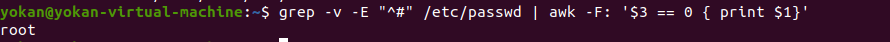 grep -v -E "^#" /etc/passwd | awk -F: '$3 == 0 { print $1}' 列出所有的超级用户账户