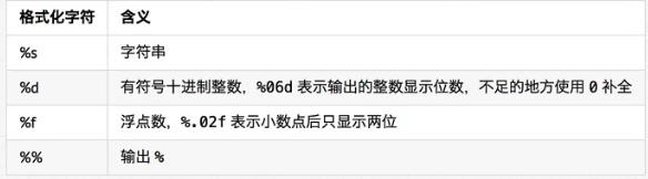 如果希望输出信息的同时输出数据,就需要用到格式化操作,%称为格式化操作符,包含%的字符串被称为格式化字符串,%和不同的字符连用,不同类型的数据需要使用不同的格式化字符。