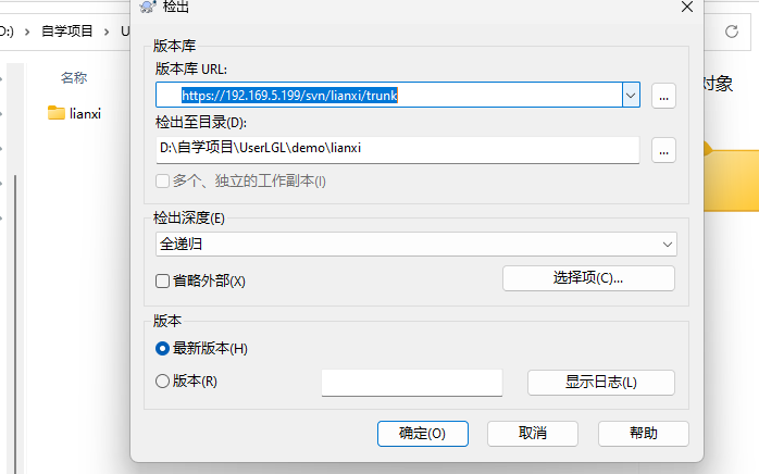 2. 复制仓库地址,本地电脑进行检出,需要检出的是主干文件夹的内容