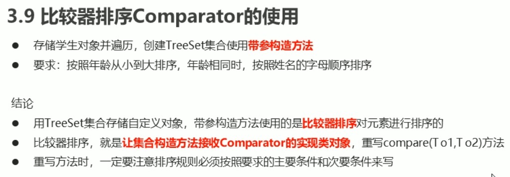 比较器排序是在: TreeSet构造方法中传递一个Comparator比较器接口, 他们的规则定义是一样的.