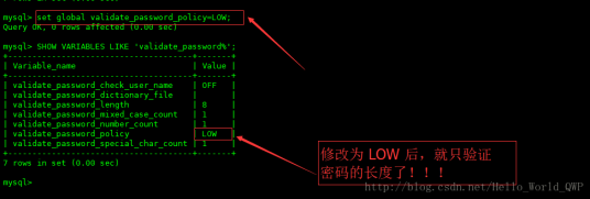 输入设值语句 “ set global validate_password_policy=LOW; ” 进行设值,