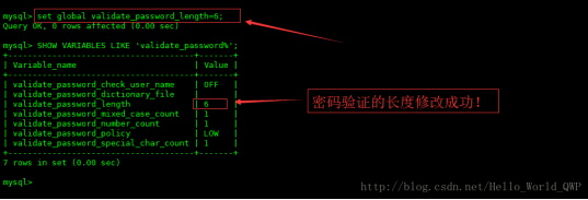 按照通用的来讲,设置为 6 位的密码,设置 validate_password_length 的全局参数为 6 即可,输入设值语句: