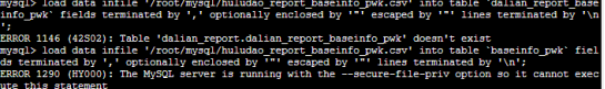 各位看官到此看明白了吗,那就是我的原始数据存储的目录错误,应该为服务器上的/var/lib/mysql-files/中,只好远程再次上传到这个目录中,然后将上面导入语句/root/mysql/进行修改,修改为: