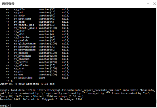 mysql> load data infile '/var/lib/mysql-files/huludao_report_baseinfo_pwk.csv' into table `baseinfo_pwk` fields terminated by ',' optionally enclosed by '"' escaped by '"' lines terminated by '\n';