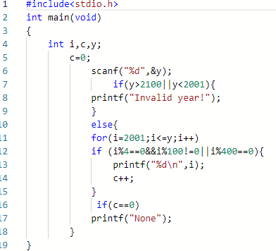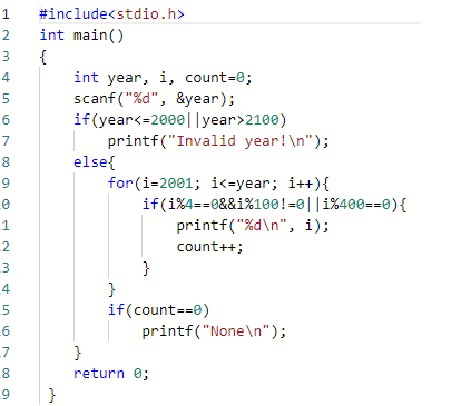 逐行输出满足条件的所有闰年年份,即每个年份占一行。输入若非21世纪的年份则输出"Invalid year!"。若不存在任何闰年,则输出“None”。