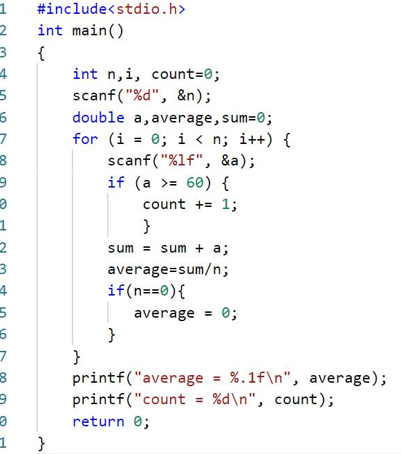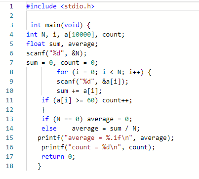 本题要求编写程序,计算学生们的平均成绩,并统计及格(成绩不低于60分)的人数。题目保证输入与输出均在整型范围内。