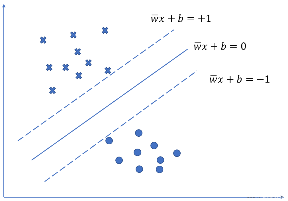 令X+和 X- 位于决策边界上,标签分别为正、负的两个样本,考虑 到分类线的距离为: