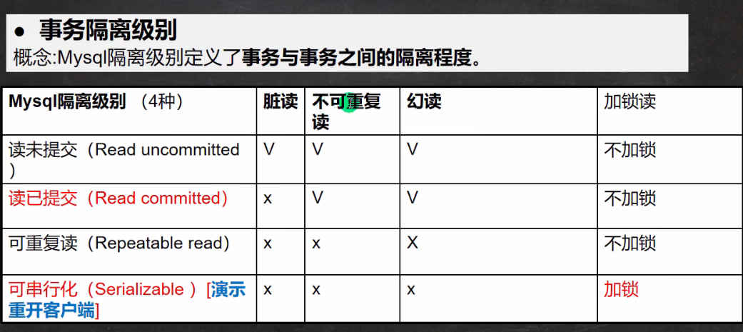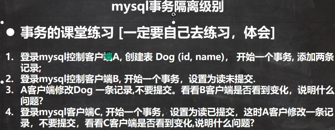 当两个 客户端操作数据库MySQL 但是当一个客户端是一个操作事物但没有提交 ,但另一个客户端是看不到的,有隔离等级,只有当commit语句时,另一个就看的见