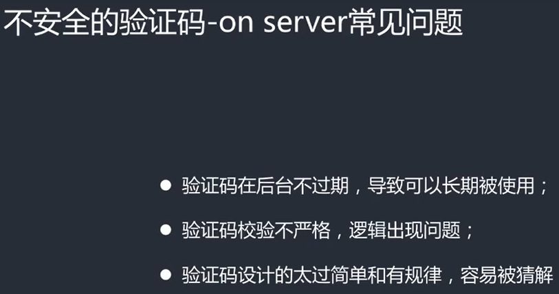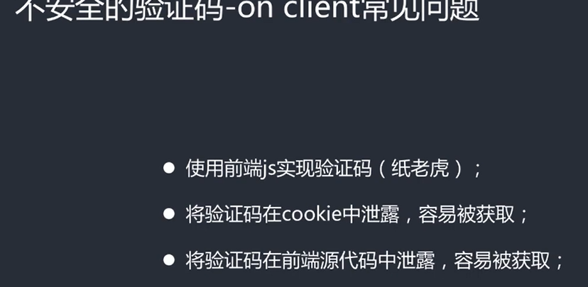 有些验证码是用文字的形式发给前端但攻击者可以提前获取验证码或者cookie