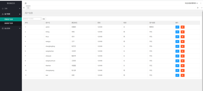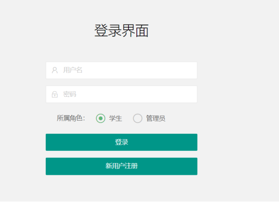 登录界面:可进行登录,分有学生(前台)和管理员(后台)两种方式。
