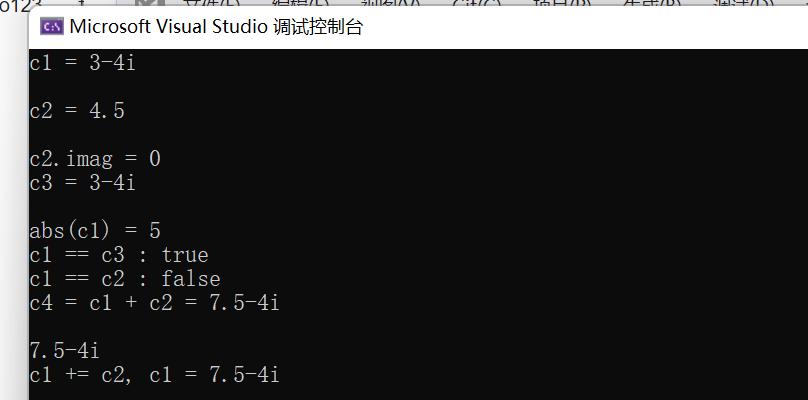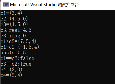 #include<iostream> #include<complex> using namespace std; int main() { complex<double>c1{ 3,4 }, c2{ 4.5 }; const complex<double>c3{ c2 }; cout << "c1=" << c1 << endl; cout << "c2=" << c2 << endl; cout << "c3=" << c3 << endl; cout << "c3.real=" << c3.real() << endl; cout << "c3.imag=" << c3.imag() << endl; cout << "c1+c2=" << c1 + c2 << endl; cout << "c1-c2=" << c1-c2 << endl; cout << "abs(c1)=" << abs(c1) << endl; cout << boolalpha; cout << "c1==c2:" <<( c1==c2) << endl; cout<< "c3==c2:" << (c3==c2) << endl; complex<double>c4 = 2; cout << "c4=" << c4 << endl; c4 += c1; cout << "c4=" << c4 << endl; return 0;