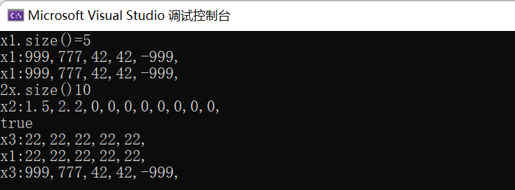 #include<iostream> #include<array> using namespace std; template<typename T> void output1(const T& obj) { for (auto i : obj) std::cout << i << ","; std::cout << "\b\b\n"; } template<typename T> void output2(const T & obj) { for (auto p=obj.cbegin();p!=obj.cend(); ++p) std::cout << *p << ","; std::cout << "\b\b\n"; } int main() { array<int, 5>x1; cout<<"x1.size()="<<x1.size()<<endl; x1.fill(42); x1.at(0) = 999; x1.at(4) = -999; x1[1] = 777; cout << "x1:"; output1(x1); cout << "x1:"; output2(x1); array<double, 10>x2{ 1.5,2.2 }; cout << "2x.size()" << x2.size() << endl; cout << "x2:"; output1(x2); array<int, 5>x3{ x1 }; cout << boolalpha << (x1 == x3) << endl; x3.fill(22); cout << "x3:"; output1(x3); swap(x1, x3); cout << "x1:"; output1(x1); cout << "x3:"; output1(x3); return 0; }