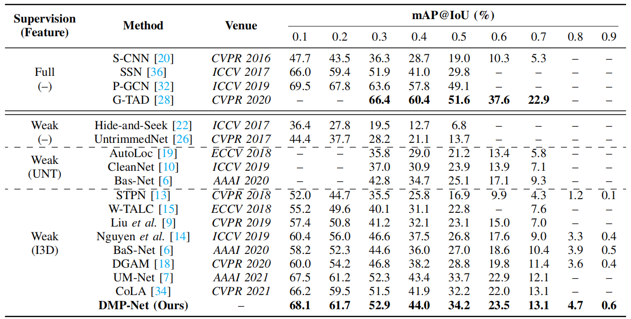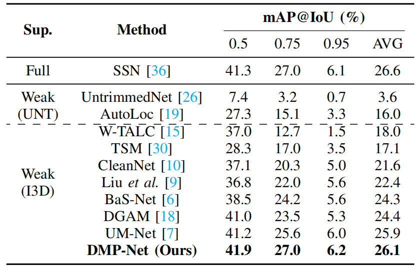THUMOS'14。我们将我们的DMP网络与THUMOS'14测试集上最先进的全监督和弱监督TAL方法进行了比较。如表一所示,