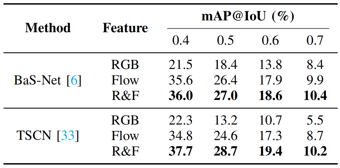 定量结果。表IV中的结果表明,基于流的方法的性能略低于两种基于流的方法,但远远超过基于RGB的方法。例如mAP@IoU在BaS Net的0.5中,基于光流的方法仅比官方的双流方法减少0.6%,而基于RGB的方法的性能大幅下降8.6%。结果表明,RGB模式对动作的敏感性较低[33],进一步验证了我们的假设,即光流模式比RGB模式信息更丰富。
