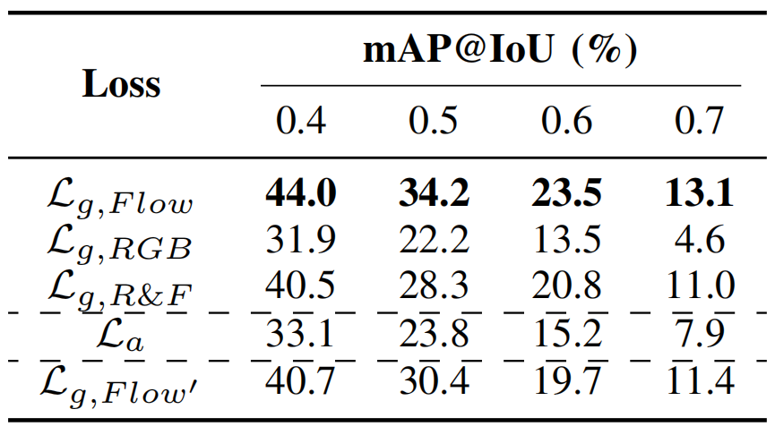 定量结果。表V中的结果表明,用La替换Lg,Flow会导致性能显著下降(例如,在mAP@0.5)这证明了运动建模是必要的,运动引导损失可以有效地指导网络训练。