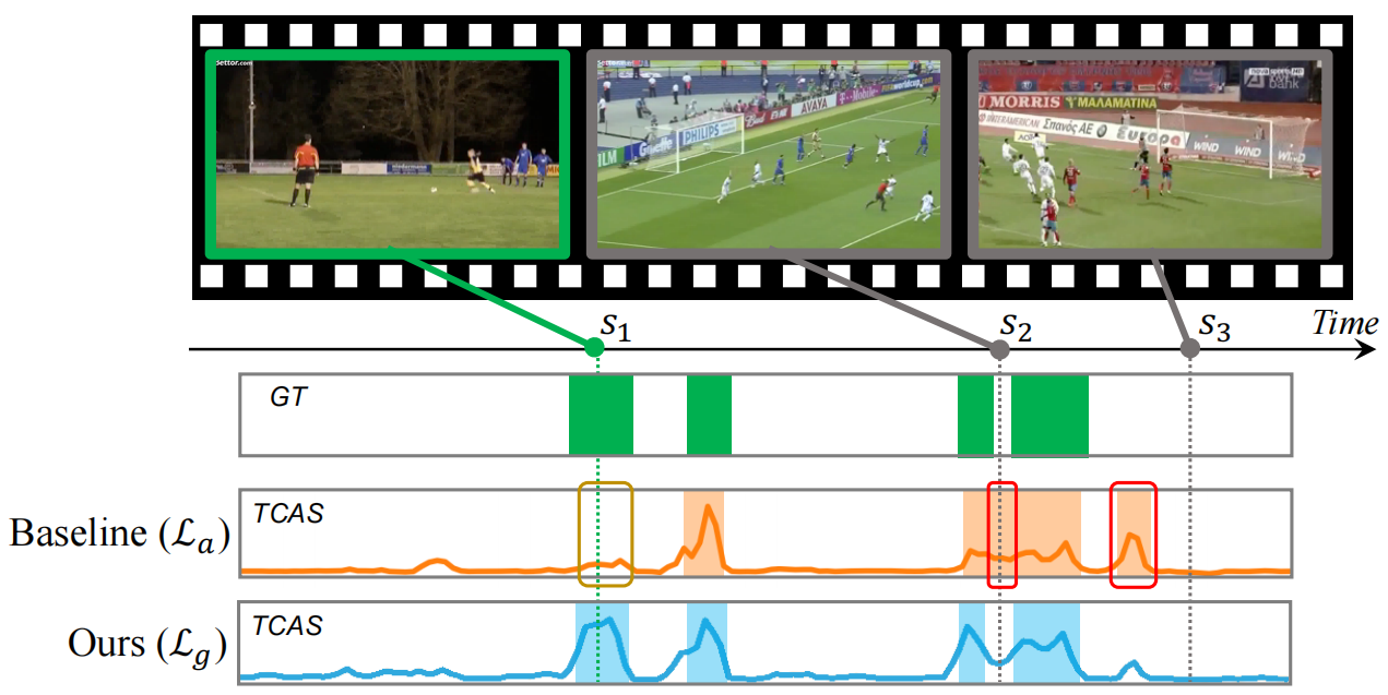 图6:THUMOS'14的足球罚球视频示例。GT表示ground-truth动作示例。TCAS表示使用Lg和La训练的SOCCER类别的TCAS分布。通过阈值化得到预测结果,并用相应的模板进行可视化。