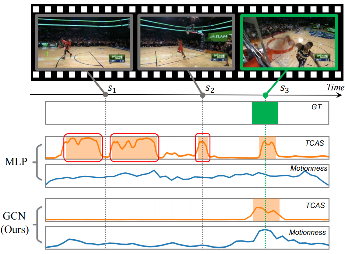 图7:THUMOS'14篮球扣篮视频示例。GT表示ground-truth行动示例。提出了利用MLP和GCN(我们的)进行篮球扣篮分类和运动分布的TCA。通过阈值化得到预测结果,并用相应的模板进行可视化。