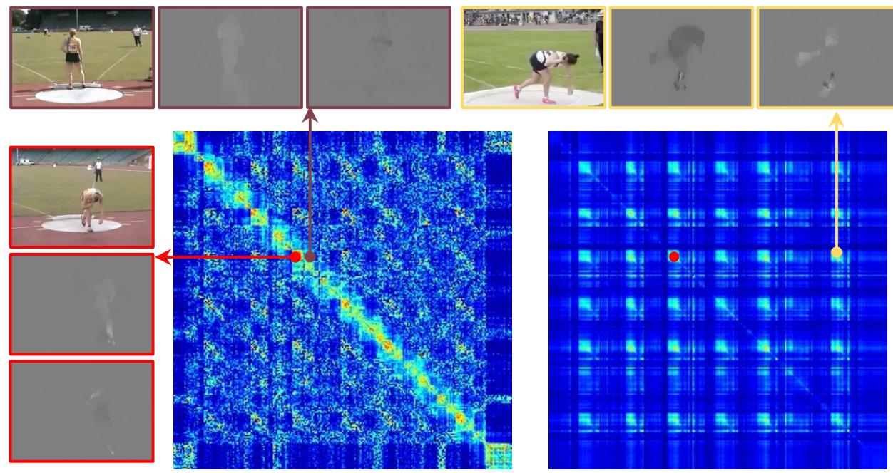 图8:铅球示例视频的相邻矩阵的可视化。左:稠密连通图;右图:我们的稀疏连接。我们选择一个标记为红色的时间节点。对于密集图和稀疏图,相关分数高的节点分别以棕色和黄色表示。