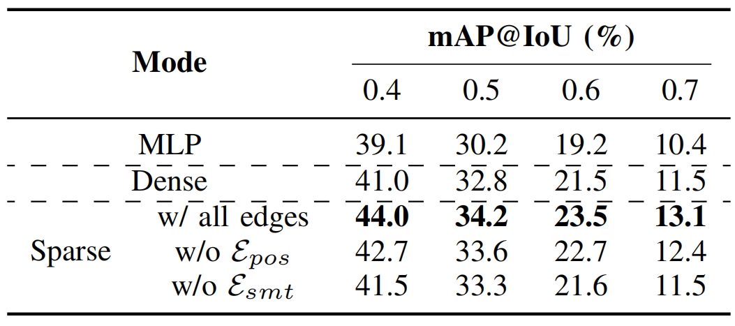 定量结果。如表六所示,完全连通图的性能落后于稀疏图(即w/ all edges)。例如,在mAP@IoU0.5时,性能下降了1.4%(34.2%v.s。32.8%)。