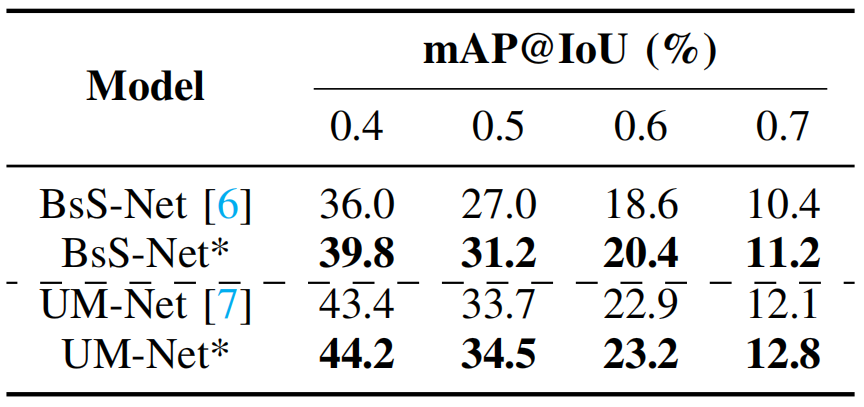 定量结果。如表七所示,我们的运动引导损失导致两种方法的持续改进。例如,在BaS网络中,mAP@IoU应用我们的运动引导损失后,0.5提高了4.2%。这些结果表明,我们的运动引导损失是通用的,并且与不同的backbone兼容。