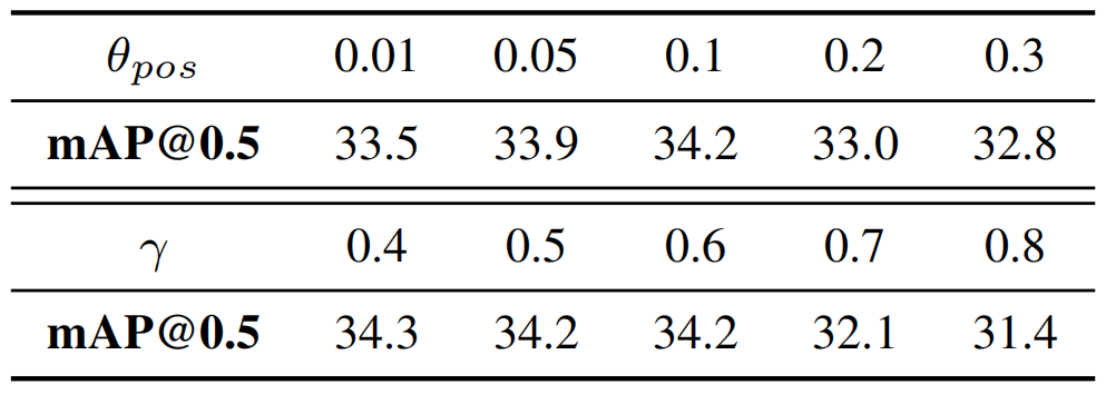 表八:对位置阈值θpos和相似度阈值γ的消融分析。