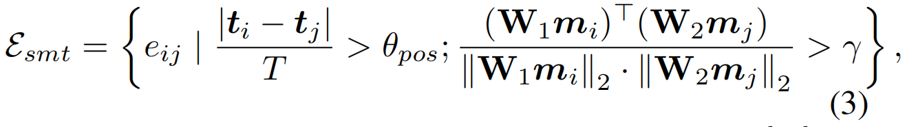 为了缓解这种情况,我们构建了一个具有稀疏边缘连接的运动图,并鼓励位置相邻的片段和语义相关但不相邻的片段。形式上,设G={M,E}是具有节点集M和边集E的节点图。此外,与G相关联的邻接矩阵表示为G∈RT×T。对于图G,每个节点(即mi∈ Rd)被初始化为相应片段的光流特征。在这里,我们通过利用位置意识和语义相似性设计了两种边构造方法,即:EposUEsmt