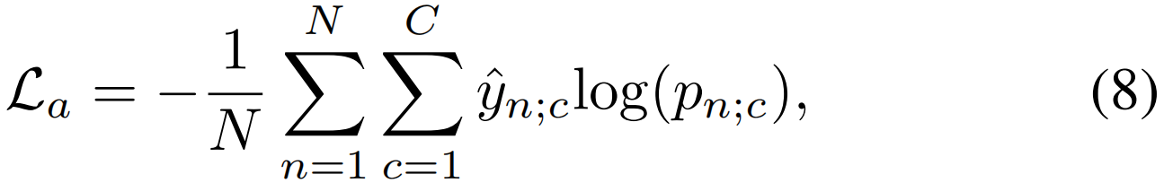 (r是选择比率)项,并计算它们的平均值作为an;c,即视频Vn的类c的视频级类得分。对应所选元素的索引集记为San;c。在获得所有C类的an;c之后,我们在an上沿类维度应用Softmax函数来得到视频级类的可能性pn∈RC,即pn=softmax(an)。然后以交叉熵的形式计算XE损失(La):