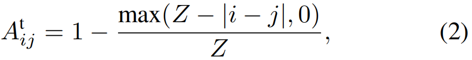 时间扩散图。由于在连续段之间存在高度的时间依赖性,因此我们在构造图时也考虑了时间信息。在自然界中,时间上接近的片段通常具有较高的概率属于相同的动作,并且往往有较高的相似性,即相应的边权值应该相对较大。此外,在实际应用中,特征提取网络中的时间卷积(即我们实验中的I3D)可以在较短的时间窗口内融合相邻段之间的时间信息。这导致了时间接近段之间更高的特征相似性(即,当i→j时,Asij趋于较大)。因此,如果我们基于上述事实构造时间图,并将其直接添加到段相似度图中,互补信息的传播可能会在较短的时间窗口内受到限制,不能在距离很远的段之间成功共享。例如,包含高质量判别动作示例的第i段Si不能补充其他在时间上远离Si的劣质示例(属于同一动作)。