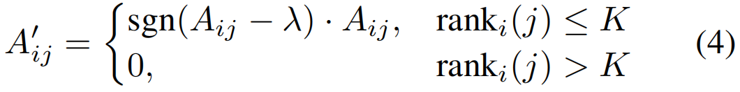 其中,两个矩阵As和At分别包括Asij和Atij作为它们的第(i,j)项,α超参数是为了对两个子图进行更好的权衡。由于这两个子图的边权值大多大于零,因此简单地将它们组合起来形成ACG将生成一个非常密集的图。如果我们直接学习基于这个密集图的增强特征,对于每个节点/片段,我们可能会获得相似的全局视频级特征,因为每个节点都需要感知所有剩余节点的特征。这隐含地妨碍了段级特征的可辨别性,导致定位结果不太准确。因此,有必要使图足够稀疏,只保留那些信息量最大的节点。特别地,我们设置了基于阈值λ和top-K排名列表的稀疏化标准。最终的稀疏ACG被构造为: