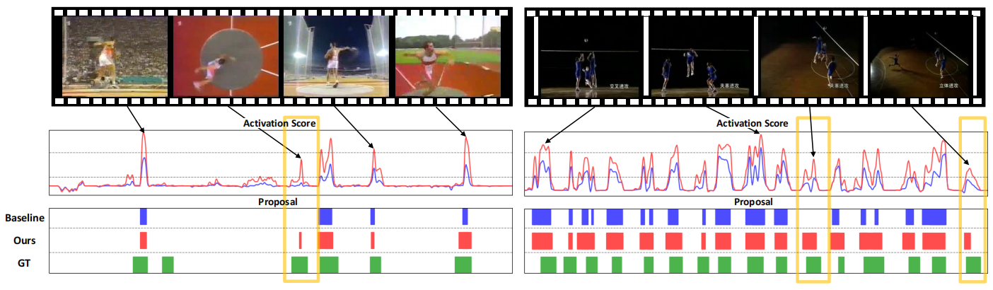 图3:在THUMOS'14上的两个典型视频示例的定性可视化。BaS-Net(基线)、BaSNet+ACGNet(Ous)和ground-truth(GT)的结果分别用蓝色、红色和绿色表示。黄色的方框包括一些Bas-Net无法检测到的困难情况,但可以通过我们的方法成功地定位。